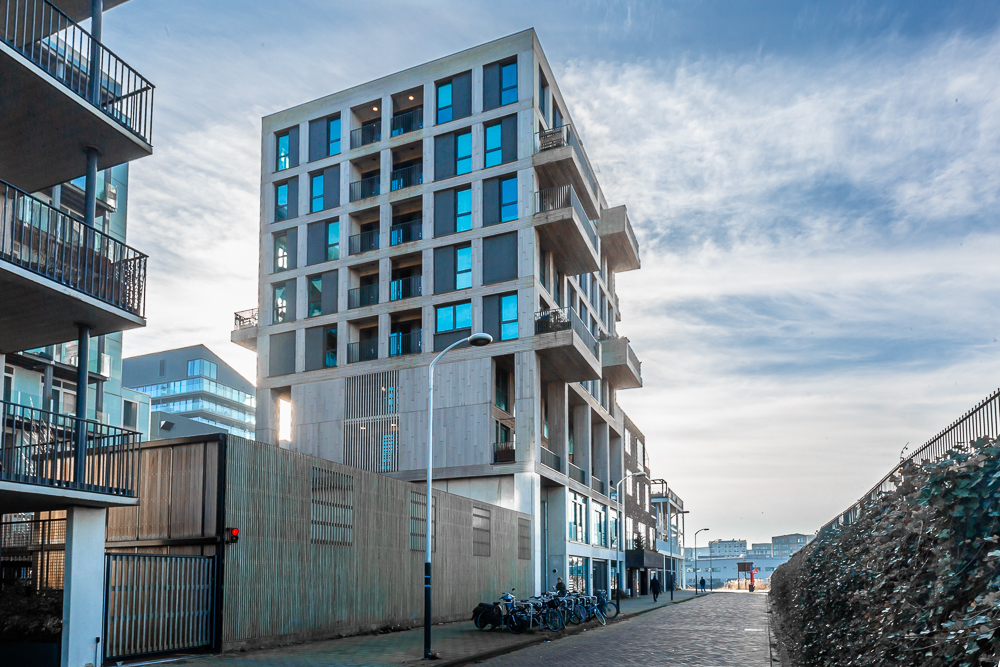 In Floating Gardens, the entire façade of the building contributes to enabling sustainable living. The horizontal façade bands consist of unique, white solar panels and act as fixed sunshades. Vertical, glass panels provide the necessary acoustic protection, while wooden cladding and planters provide a green look.
